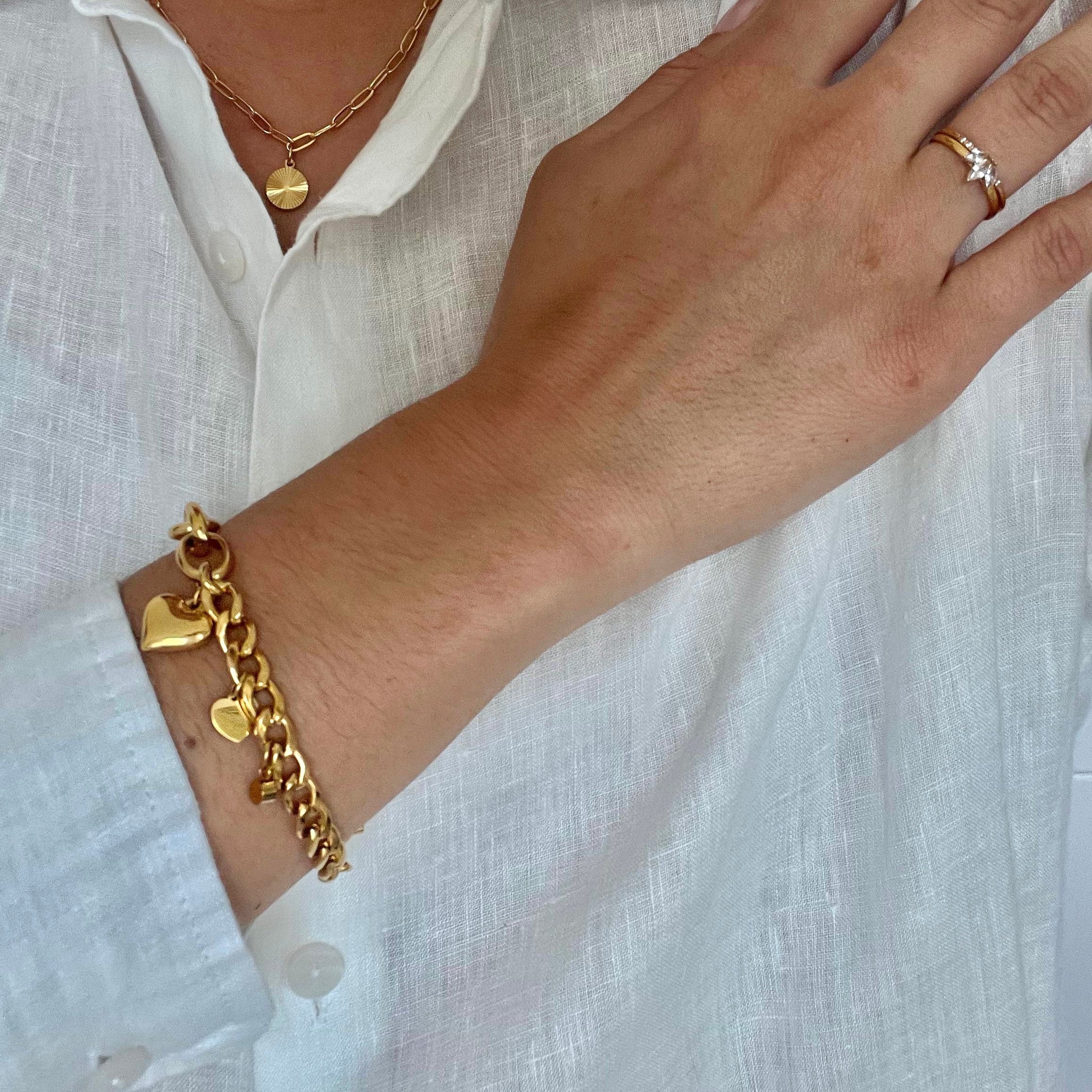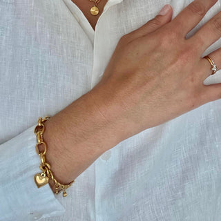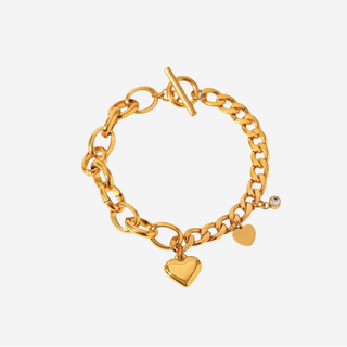 Bold yet feminine, the Elise Bracelet features an asymmetric chain design with contrasting links that balance strength and elegance. Accented by a polished heart charm and a smooth round pendant, it’s a timeless statement of confidence and grace — designed to elevate both everyday and evening looks.