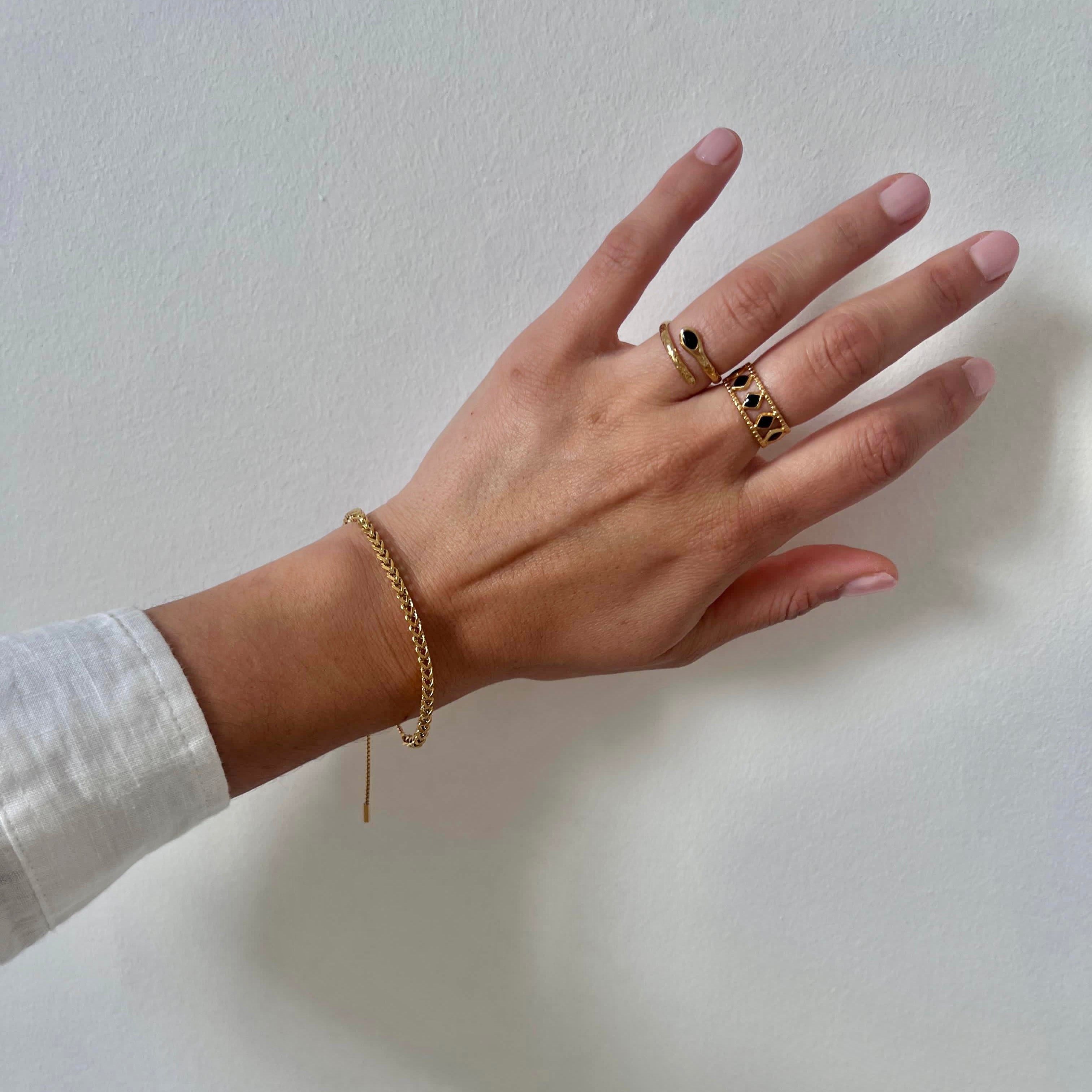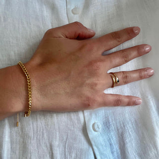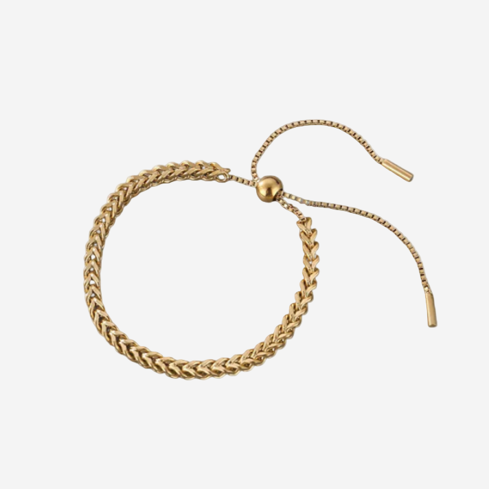 A refined statement of understated luxury, the Sienna Bracelet embodies effortless sophistication. Designed with a smooth adjustable chain, it offers a comfortable fit and a subtle gleam that elevates any look — from casual denim to evening silhouettes. Its clean lines and minimal shape make it a timeless piece for everyday elegance.