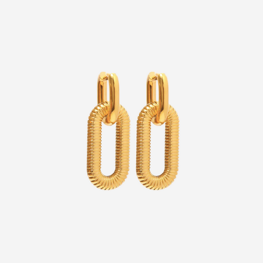 Statement earrings with a modern linked silhouette — bold yet refined. Their sculptural shape adds a contemporary touch that transitions effortlessly from day to night. ✧ Material: 304 stainless steel✧ Real gold plated, PVD coated✧ Waterproof...Regular price $40.00 -