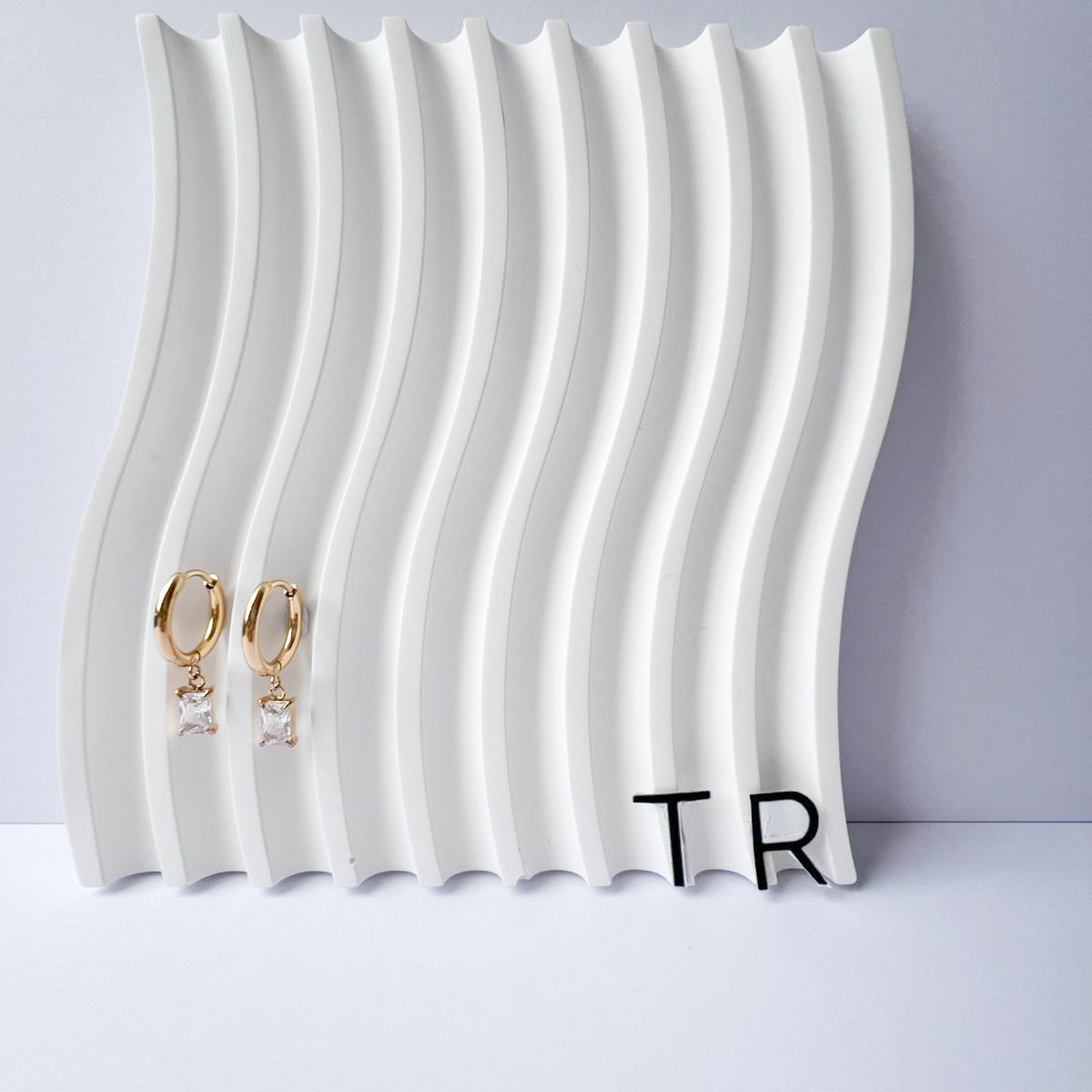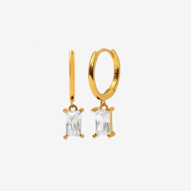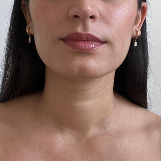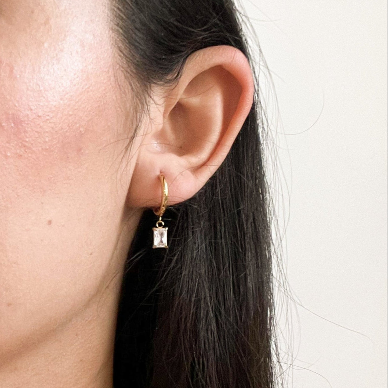 The Charm Hoops bring a touch of elegance with their delicate rectangular stone drop, catching the light with every move. Lightweight and timeless, they’re perfect for elevating your everyday look or adding sparkle to a special night.