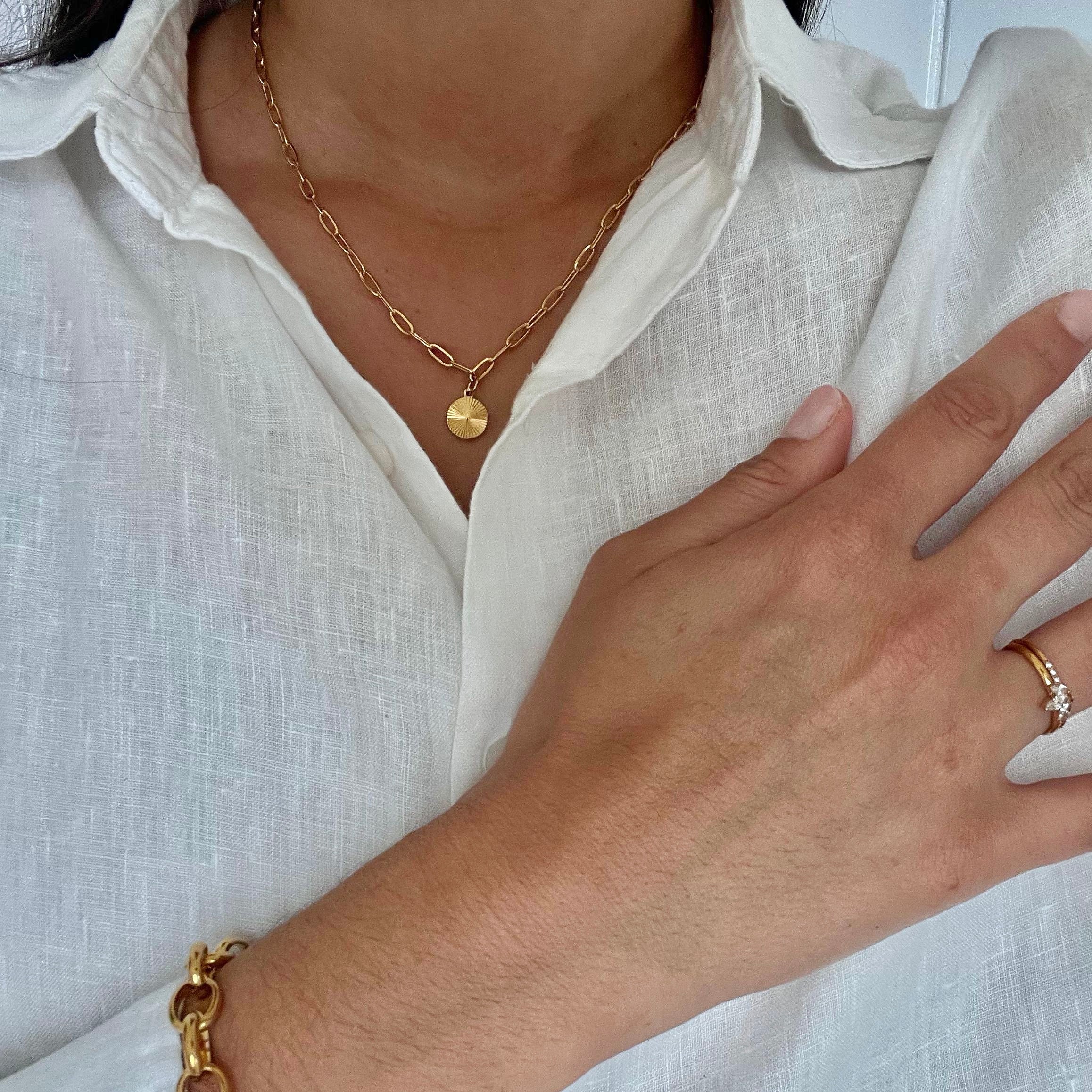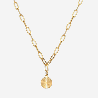 A modern statement of subtle radiance — the Oryn Necklace features a sleek link chain adorned with a sculpted sun-inspired pendant that captures the light beautifully. Designed to elevate everyday wear, it blends minimal elegance with timeless energy.