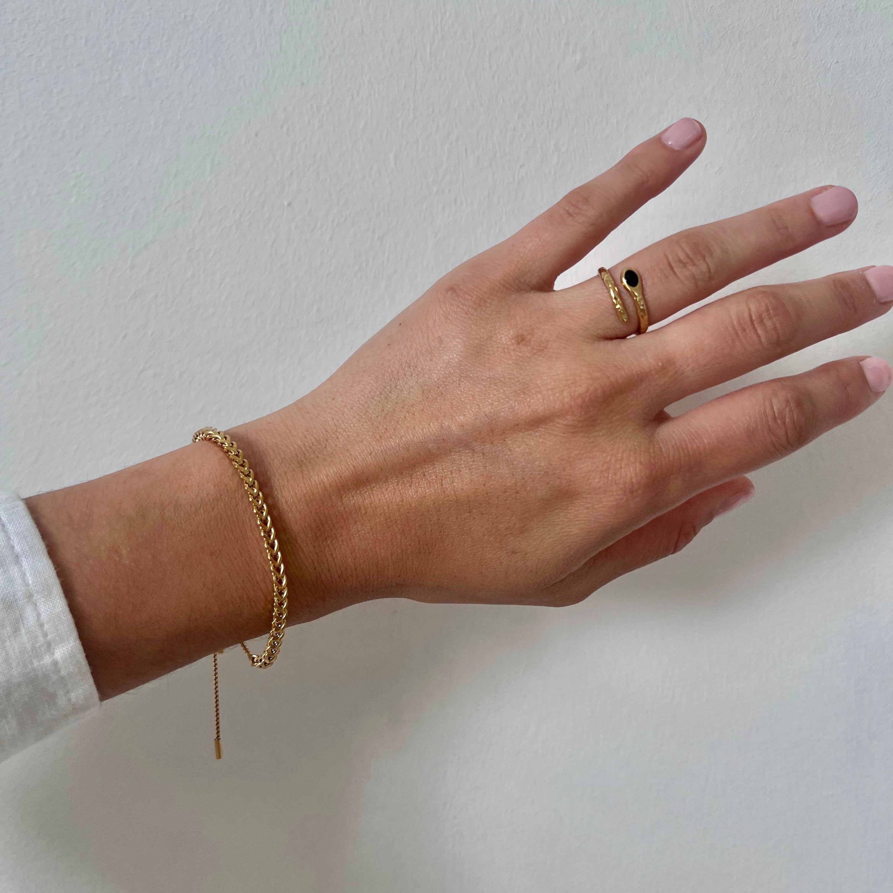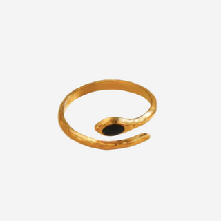 A refined open ring that plays with contrast and flow. Its smooth golden curves embrace a deep black stone, capturing balance between simplicity and strength.